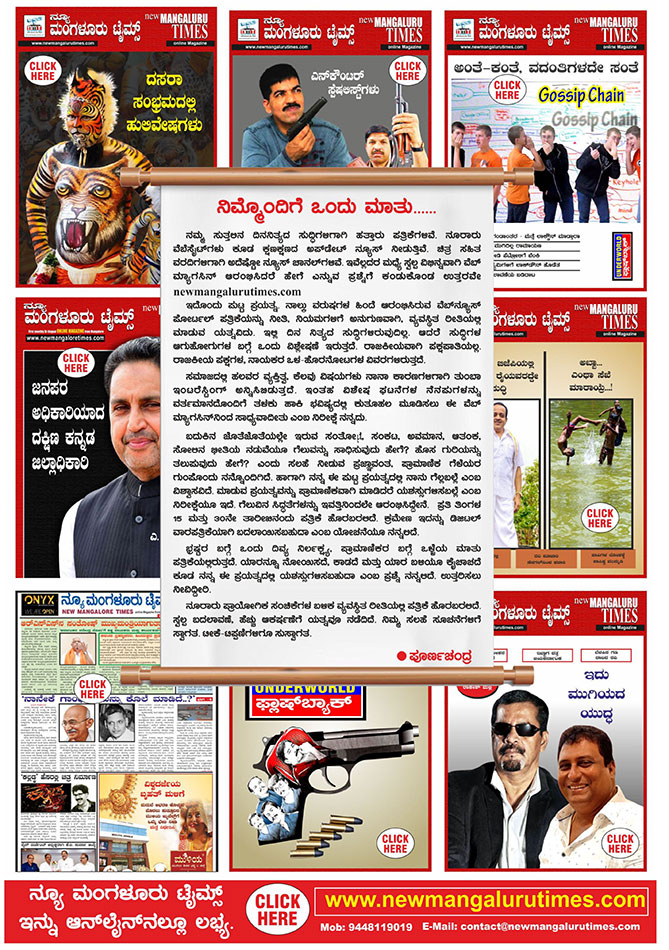 ನಮ್ಮ ಸುತ್ತಲಿನ ದಿನನಿತ್ಯದ ಸುದ್ಧಿಗಳಿಗಾಗಿ ಹತ್ತಾರು ಪತ್ರಿಕೆಗಳಿವೆ. ಚಿತ್ರ ಸಹಿತ ವರದಿಗಳಿಗಾಗಿ ಅದೆಷ್ಟೋ ನ್ಯೂಸ್ ಚಾನಲ್‍ಗಳಿವೆ ಇವೆಲ್ಲದರ ಮಧ್ಯೆ ಸ್ವಲ್ಪ ವಿಭಿನ್ನವಾಗಿ ವೆಬ್ ಮ್ಯಾಗಸಿನ್ ಆರಂಭಿಸಿದರೆ ಹೇಗೆ ಎನ್ನುವ ಪ್ರಶ್ನೆಗೆ ಕಂಡುಕೊಂಡ ಉತ್ತರವೇ newmangalurutimes.com
